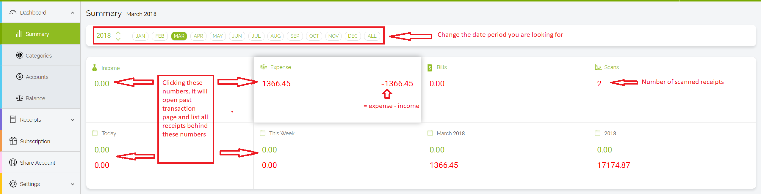 You can switch between Summary, Summary by Category, Summary by Account and Balance. You can change the time frame for each of them. -